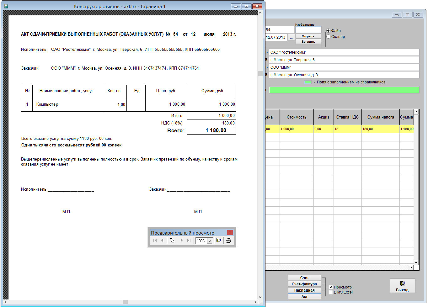 Откроется печатная форма акта. Для вывода на принтер (по умолчанию) нажмите кнопку с изображением принтера на панели "Предварительный просмотр".