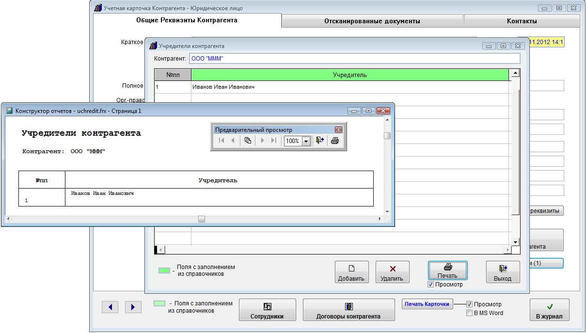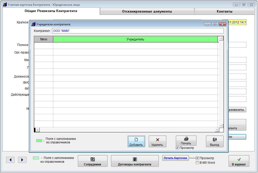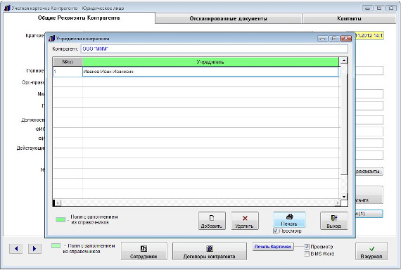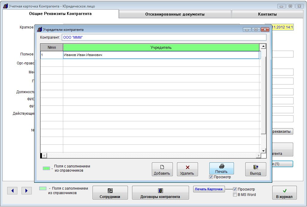 Для печати списка учредителей данного контрагента нажмите кнопку "Печать" с изображением принтера.