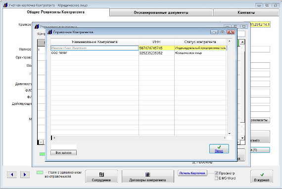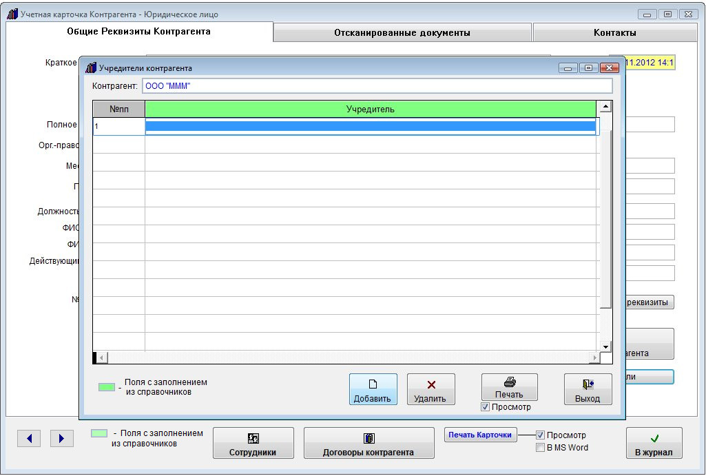 Для выбора ранее внесенного контрагента из списка контрагентов дважды щелкните мышью по добавленной строчке по полю Учредитель.
