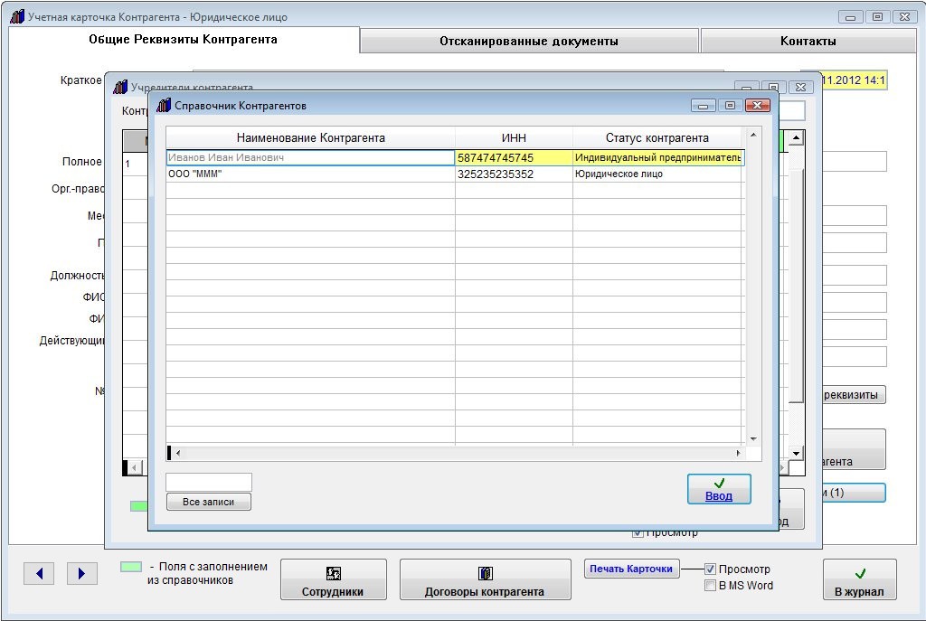 Выберите нужного контрагента, который является учредителем и нажмите Ввод.