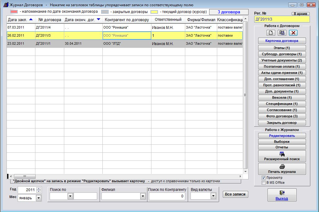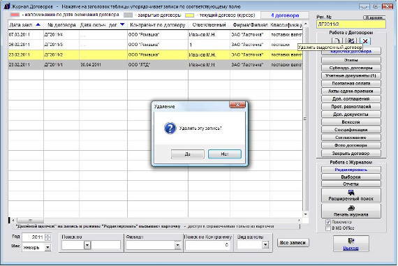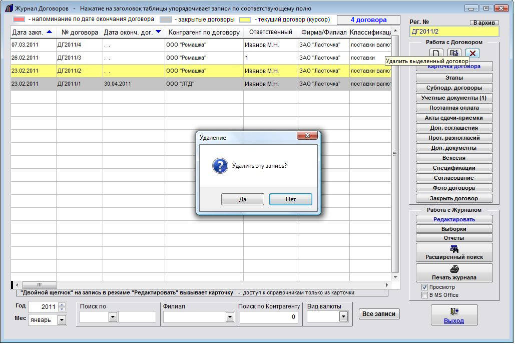Для удаления договора в журнале договоров установите курсор на договор с нужным номером.