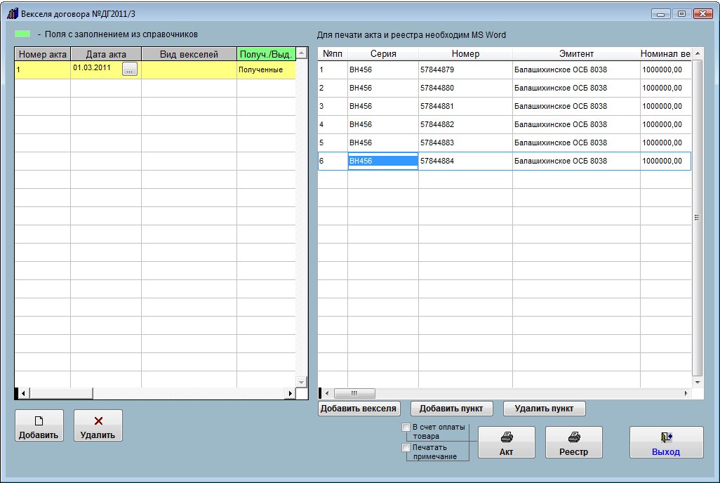 С помощью кнопки "Добавить пункт" можно добавить одиночный вексель.