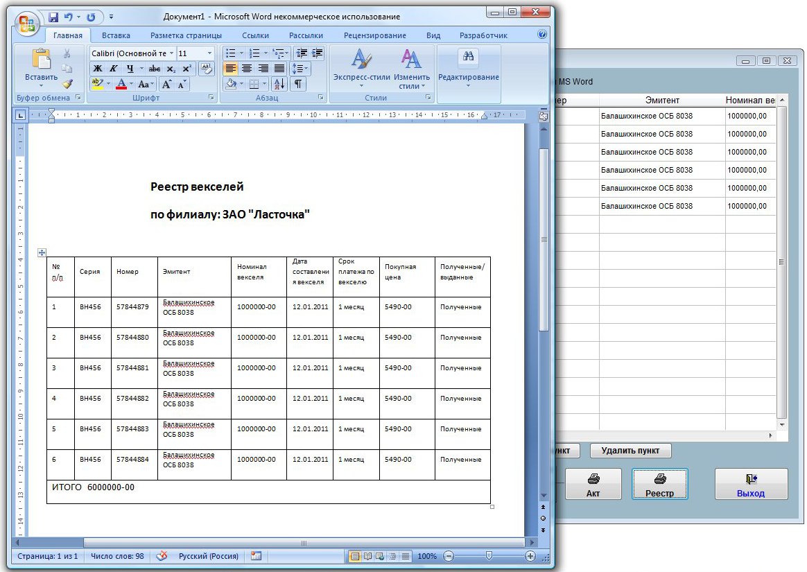 Реестр векселей будет сформирован в MS Word (либо, при соответствующей настройке, в OO Writer).