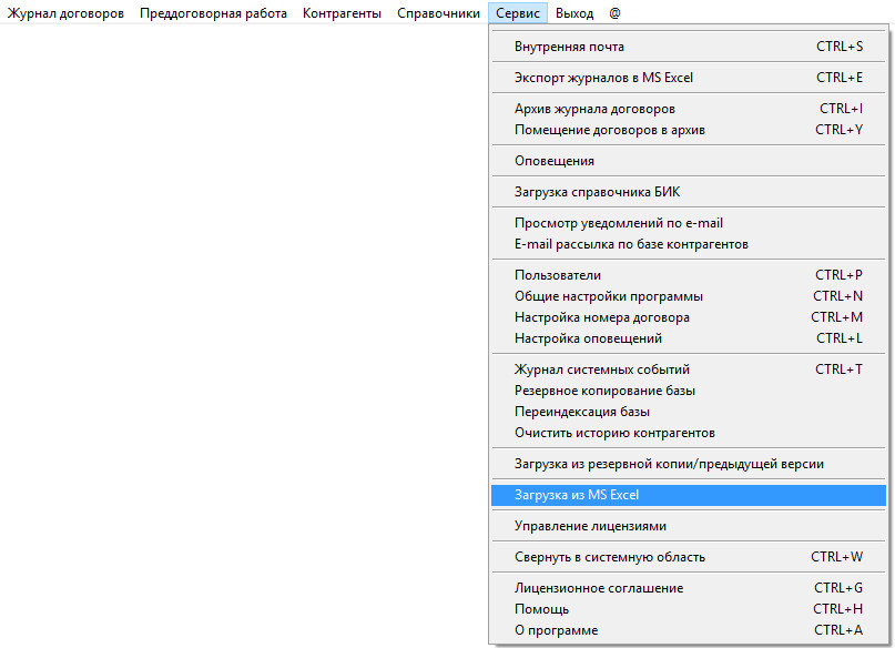 Затем запустите программу и выберите пункт меню "Сервис-Загрузка из MS Excel".