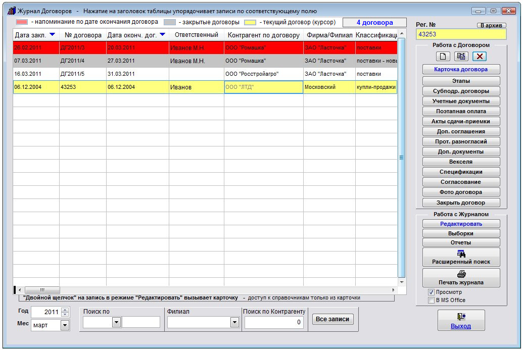 Загруженные из файла XLS договоры (в нашем случае 1 договор) отобразятся в журнале договоров.