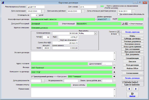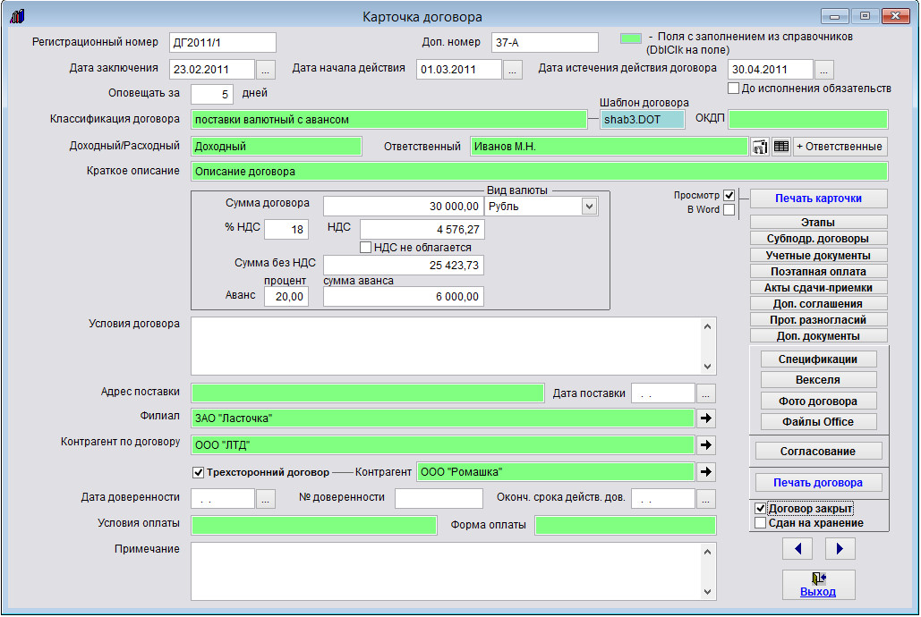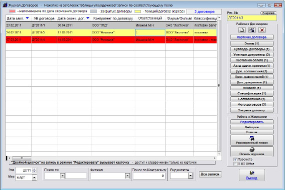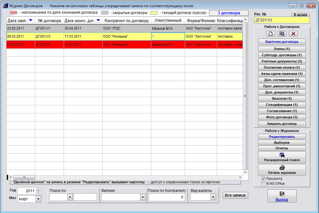 В журнале договоров закрытые договоры окрашиваются серым цветом.